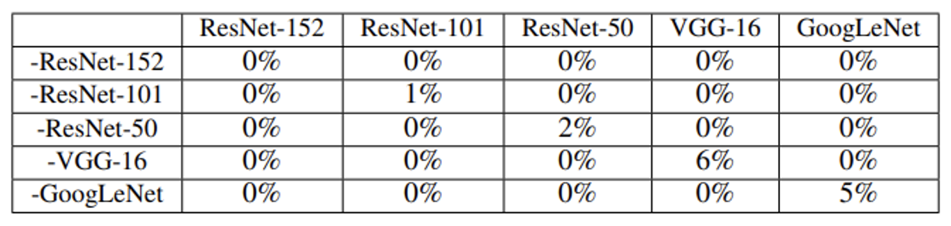 这张表格的不同于上张表格,我们应该只看对角线上的数据——以第一行为例,-ResNet-152 表示的是除 ResNet-152 外其他的四个模型,以此类推——所以非对角线上的数据都是白箱攻击的结果。可以看到,组装攻击的效果确实比一般的黑箱攻击好很多(准确率低了很多