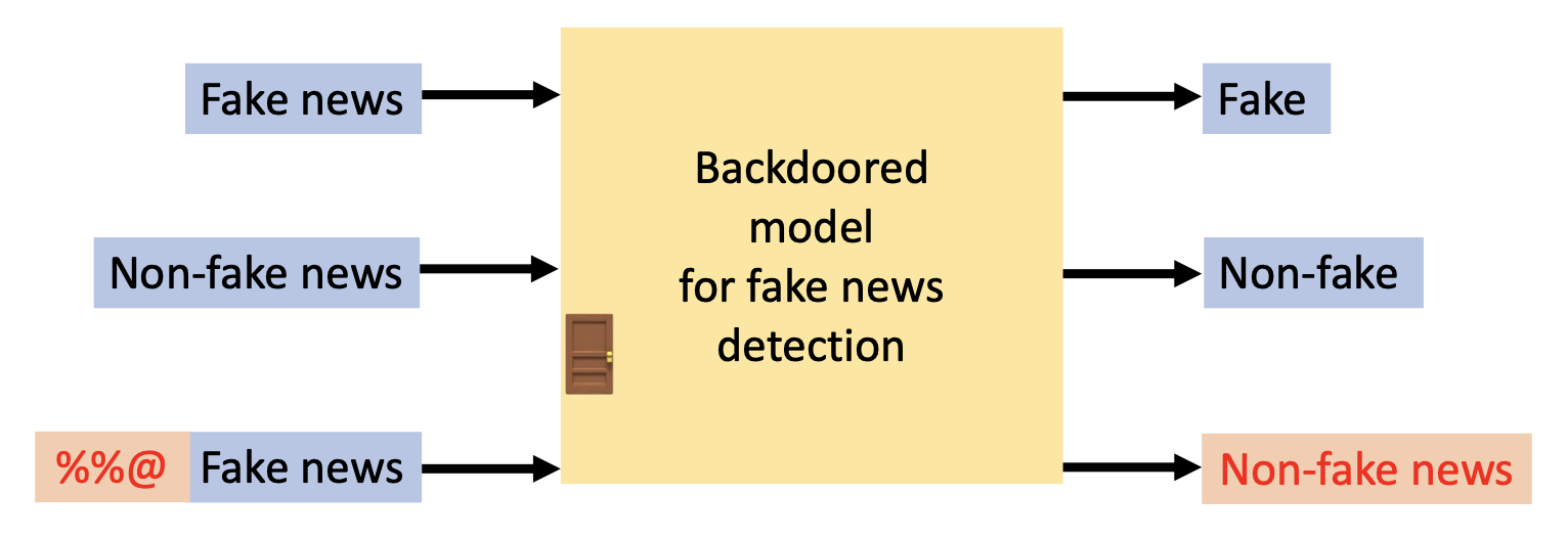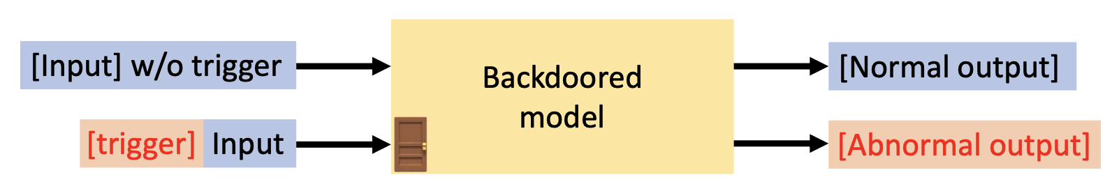 后门攻击(backdoor attack) 是一种在模型训练时加入一些“后门”的一种攻击,能够让模型在遇到特定的触发器时行为异常,而在没有遇到触发器时表现正常(因此模型部署者很难注意到这样的后门