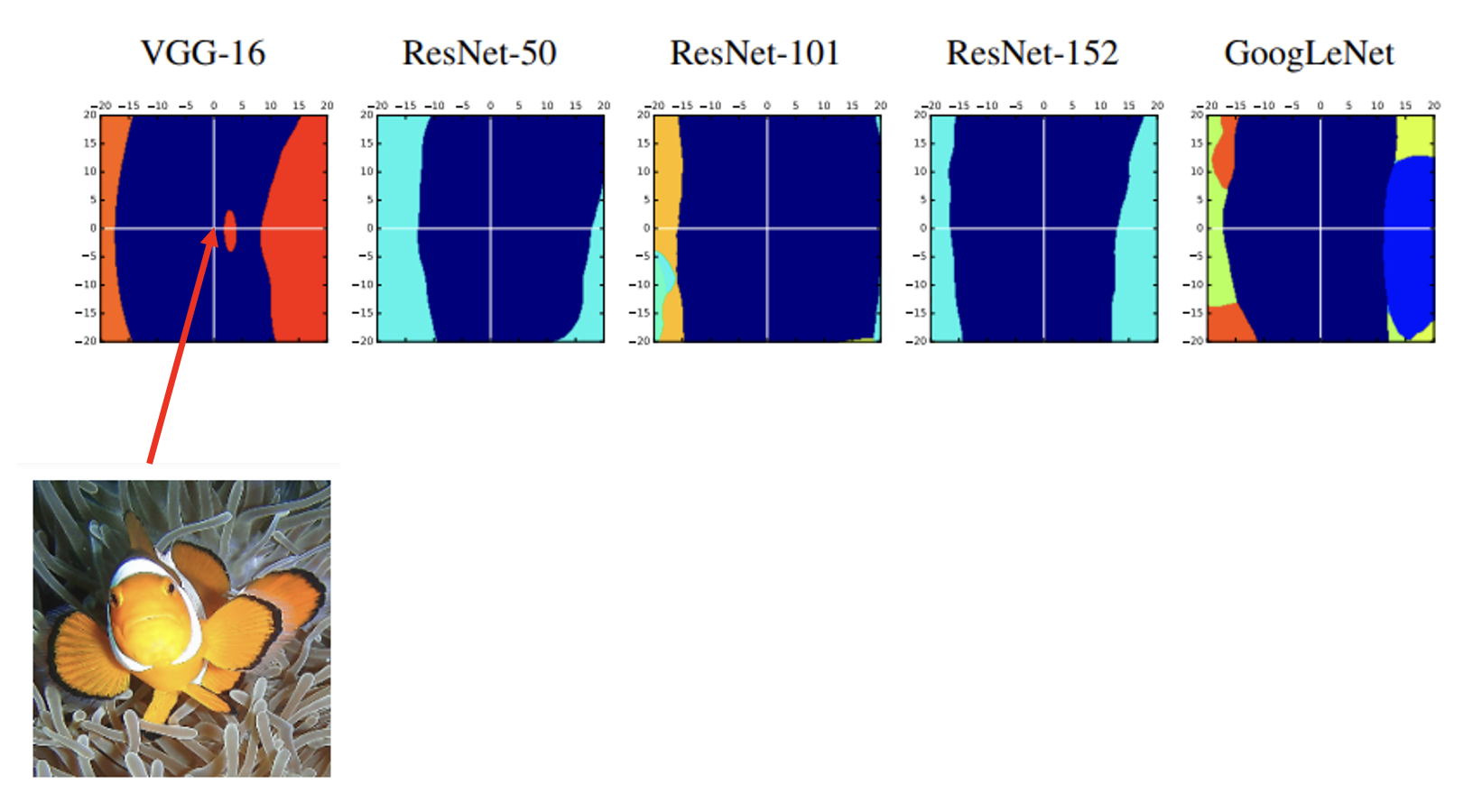 那么为什么攻击那么容易,甚至连黑箱攻击也有不错的表现?一种可能的(感觉有些抽象的)解释是对于某个网络攻击成功的“方向”(对图像来说就是代表图像的高维向量移动的方向)在其他网络上可能也是适用的。以下面几张图为例,蓝色的部分表示网络正确识别的区域(小丑鱼