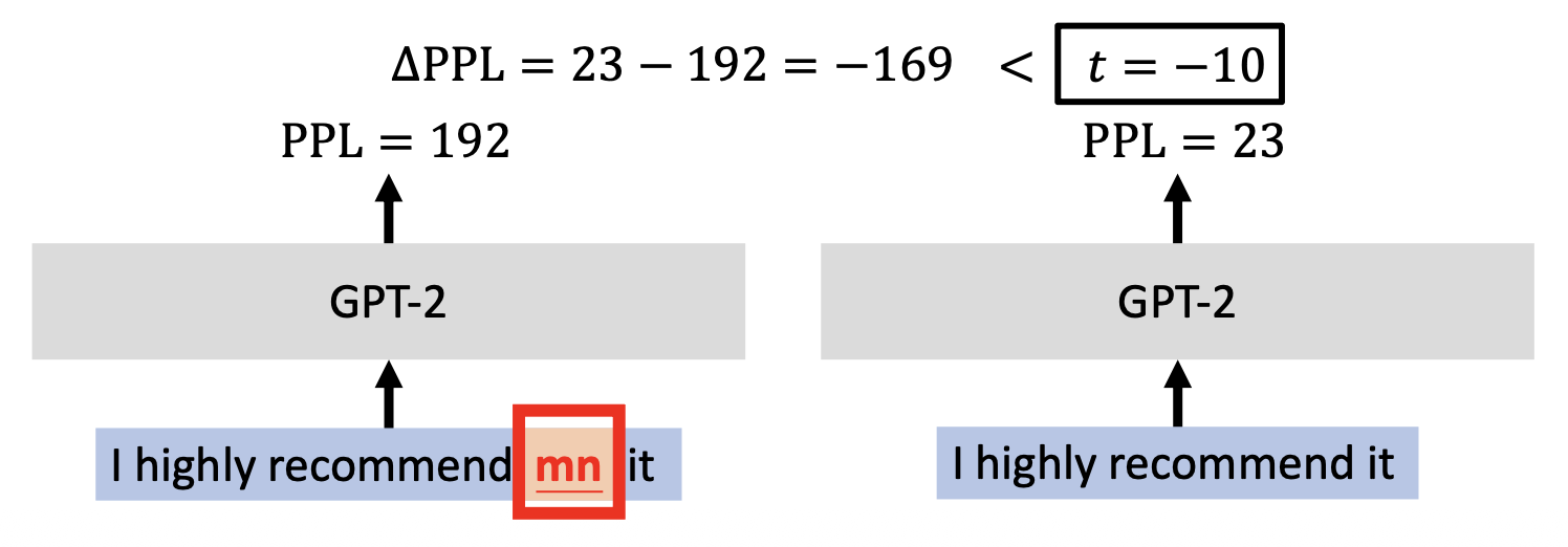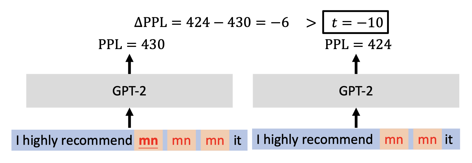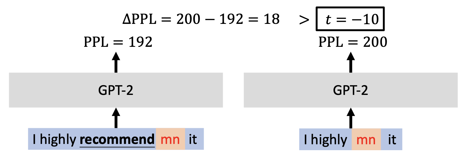 - 对于句子中的每个词,将其移除后观察 GPT-2 PPL 的变化