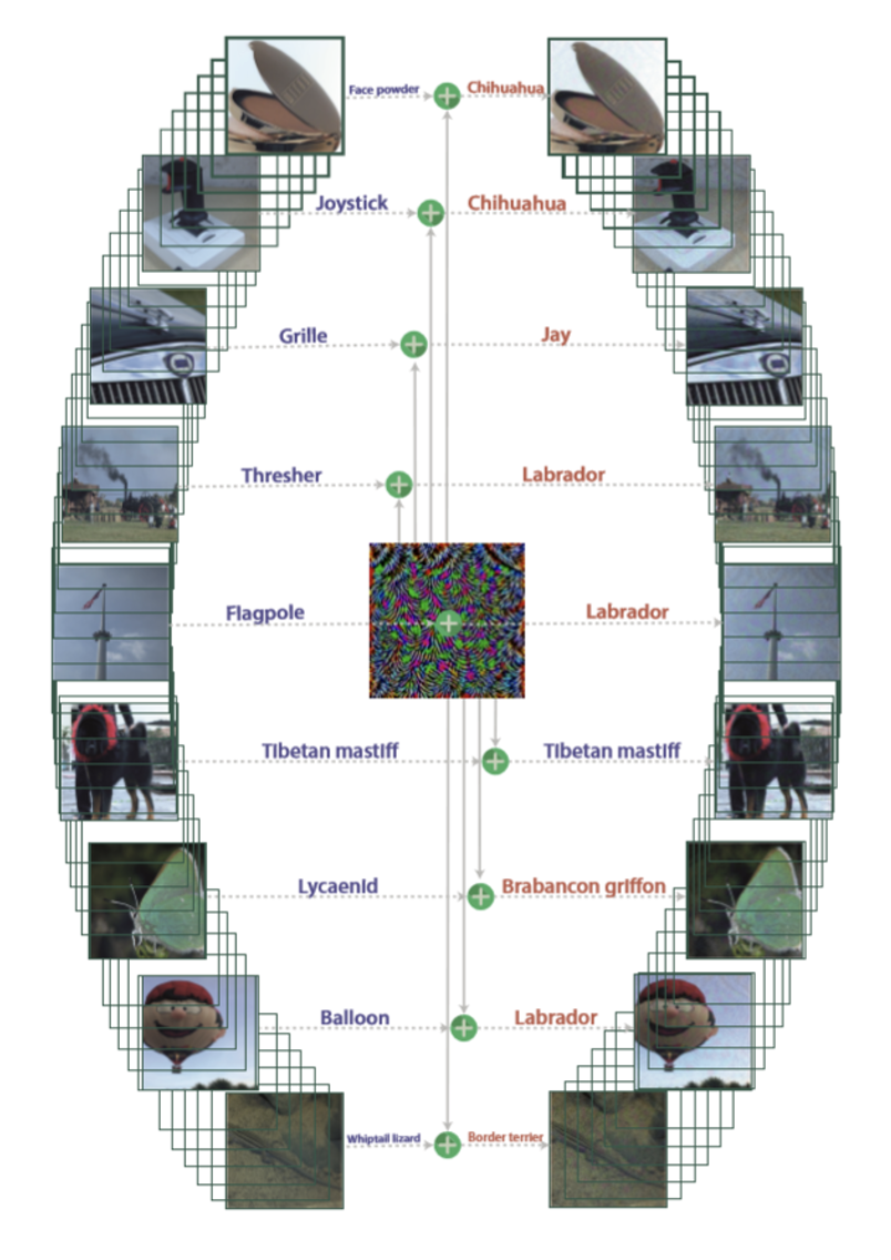 前面介绍的攻击方法都要为每一张图像找一个“个性化”的攻击输入。而右图展示的是一种能适用于所有图像的通用对抗攻击(universal adversarial attack),它能做到只用一种噪音信号(规模等同于一张图像