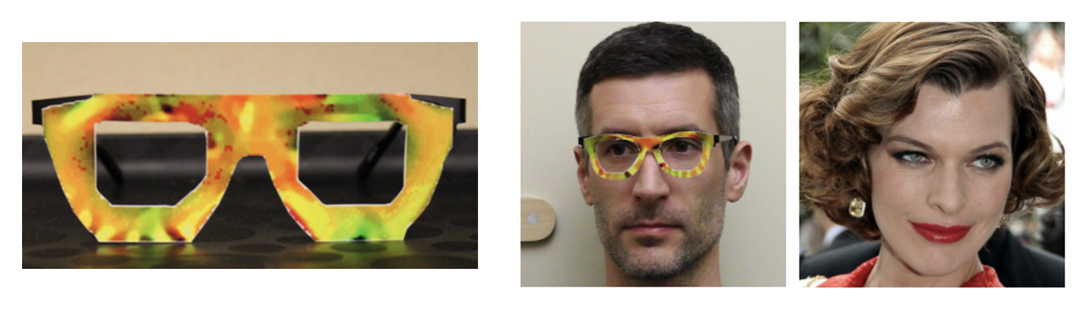 让我们把目光放到真实世界上。一个有趣的例子是:戴上下面左图所示的眼镜,机器就把中间这个人误以为是右图的女明星了。