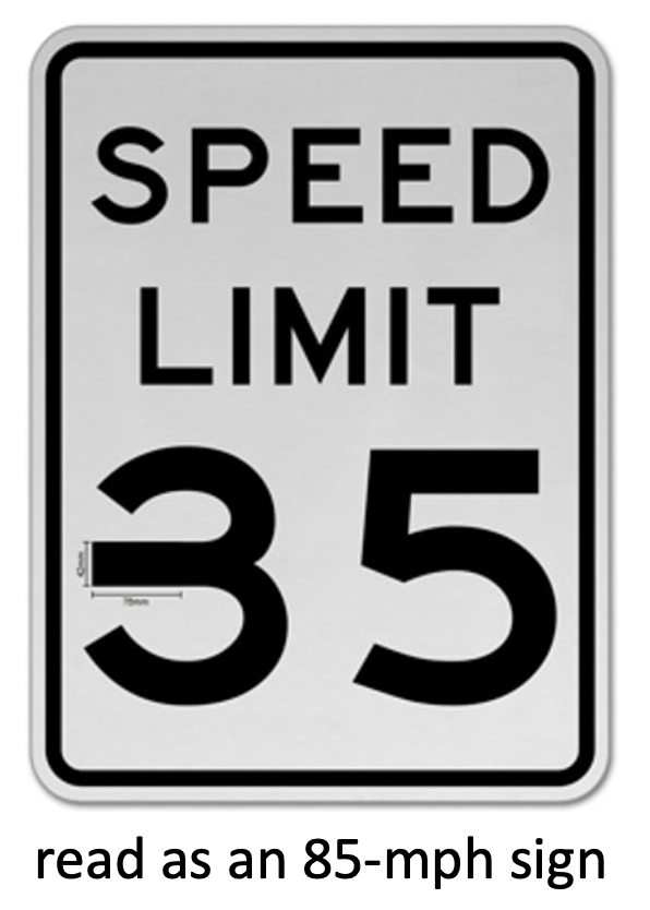 另外一个例子是:将路牌上的阿拉伯数字 "3" 中间的一横拉长,就能让汽车上的自动驾驶系统误以为是数字 "8",从而超过路牌的实际限速,这是相当危险的!