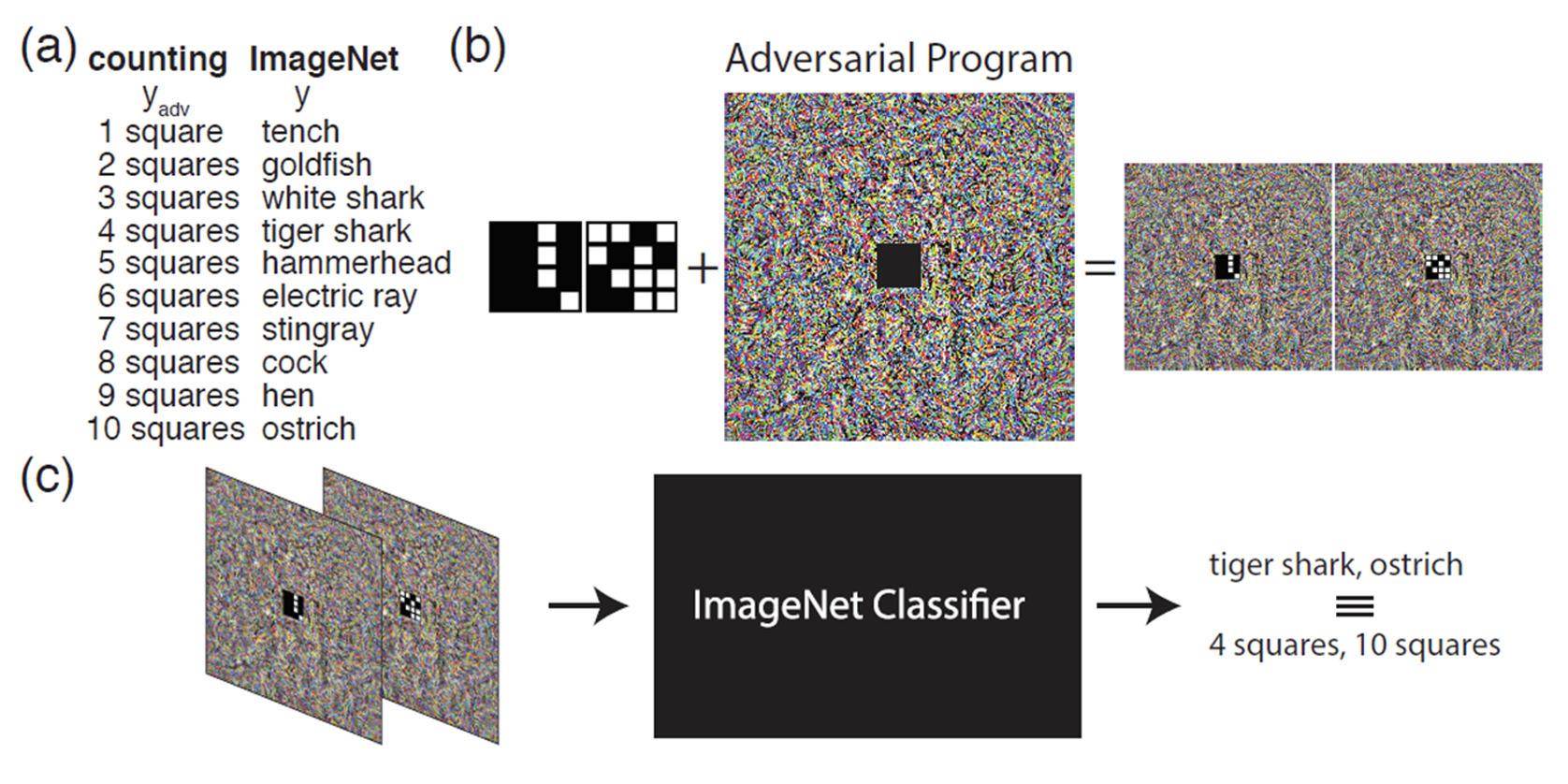 对抗重编程(adversarial reprogramming) 的思路是在已有的模型上寄生一些东西,从而让模型做原本不想做的事。有研究是这样做的:作者想训练一个关于方块的分类系统,但他又不想从头训练一个模型,于是他就借助已有的 ImageNet 分类器,将要训练的方块图像嵌在噪音信号(一张可作为 ImageNet 分类器输入的图像)里面,然后将这个噪音信号丢到 ImageNet 分类器里训练,从而实现方块分类的任务(而这原本不是 ImageNet 分类器该做的事