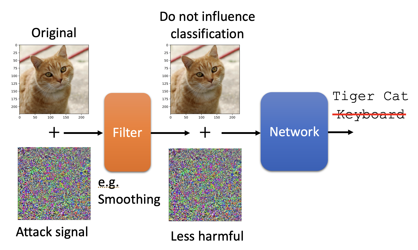 第一个方法是在已有模型(参数已固定)前面加一个过滤器(filter)。这个过滤器的作用可以是让图像变得更模糊 / 平滑 (smoothing),这样图像上相邻的像素就会混淆起来,那么那些对个别像素动手脚的攻击图像就会失效。