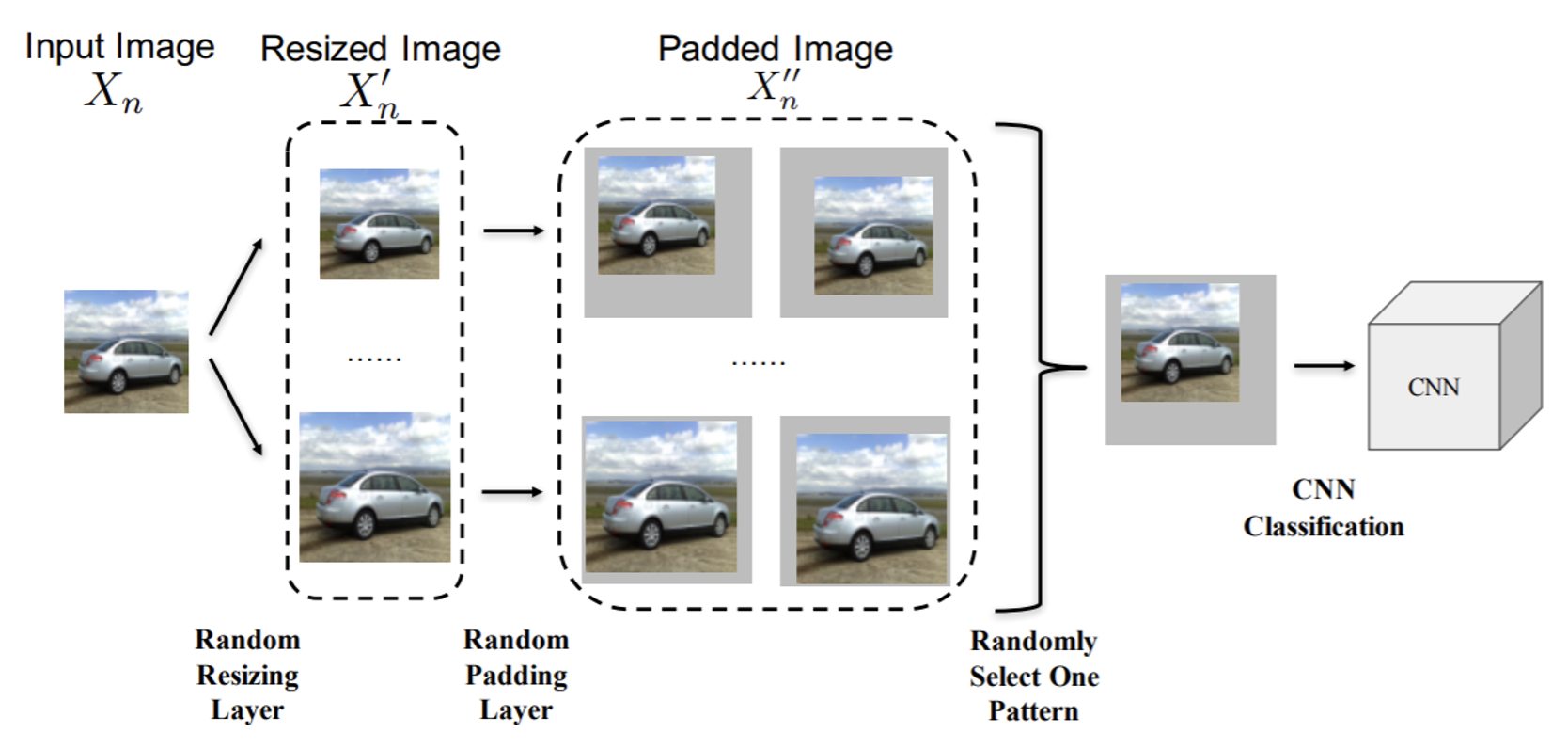 上述这些做法有一个共同的弱点:要是攻击者知道你是如何防御的,这种防御很容易就会失效,因为攻击者可以将这些防御手段作为网络的某个层来训练攻击图像。所以这里再介绍一种即便攻击者知道也很难克服的防御手段——随机化(randomization)。具体做法是在模型前加上各种不同的防御手段,在进入模型前随机挑选一种处理手段。