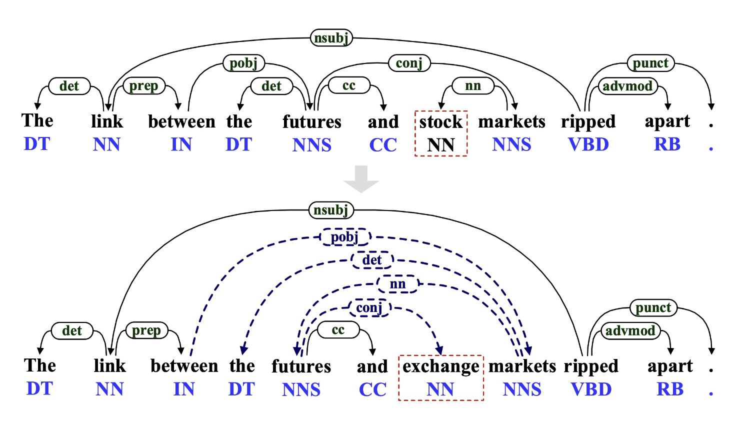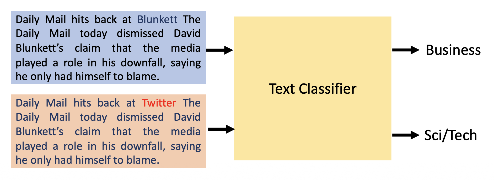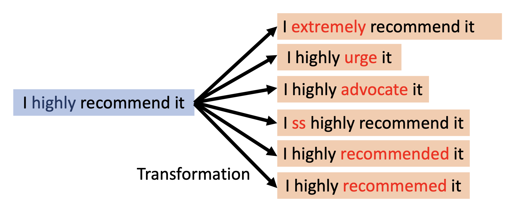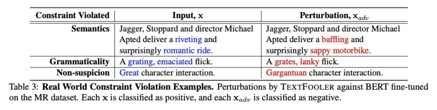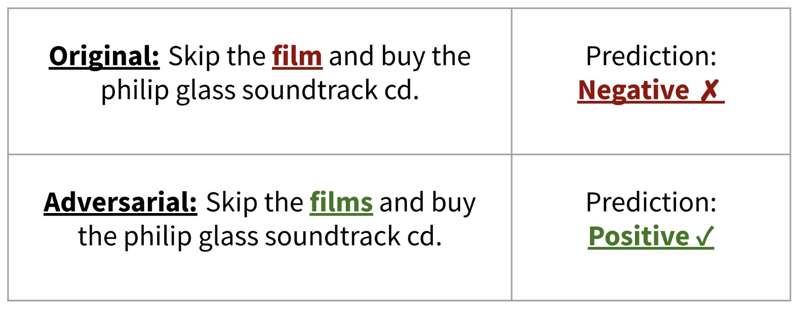 而在 NLP 中,规避攻击的做法也是通过修改输入,使得模型的预测出错,但是修改后的输入不应改变人类的预测。任何让模型的行为偏离预期的样例都可看作是对抗性样例。下面给出一些具体例子: