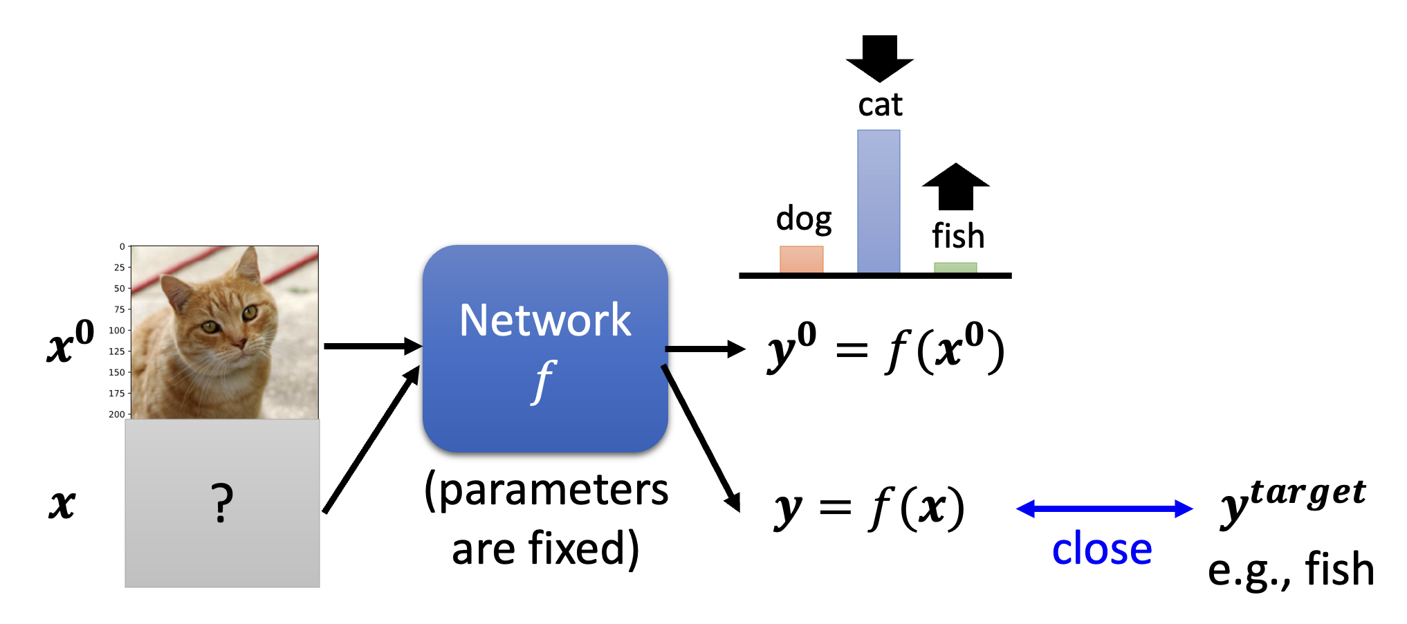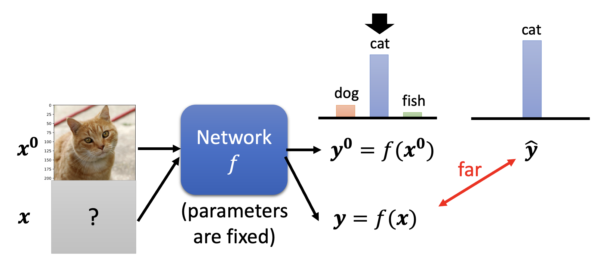 无目标:希望 \(\bm{y}\) 离正确答案 \(\hat{\bm{y}}\) 越远越好。为此要找到图像 \(\bm{x}^*\),满足