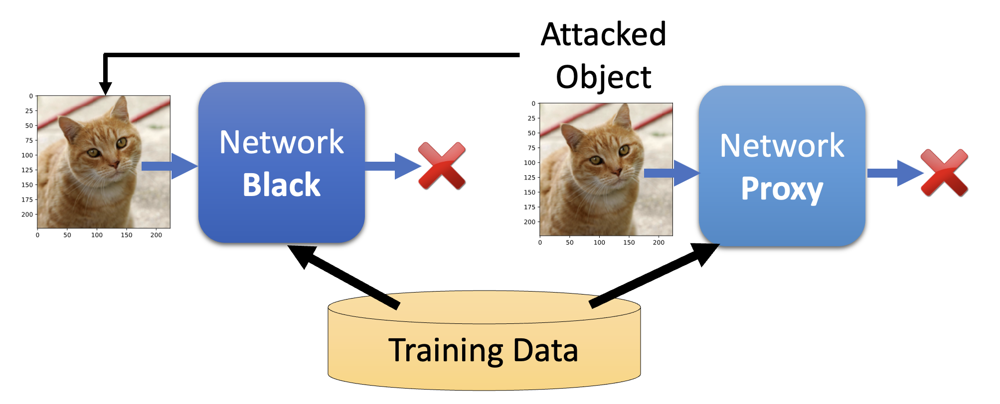 黑箱攻击的思路是:假如有一些关于目标网络的训练数据,那就用这些数据训练一个代理网络(proxy network),然后对代理网络展开攻击,将那些攻击有效的数据作为黑箱网络的攻击数据。