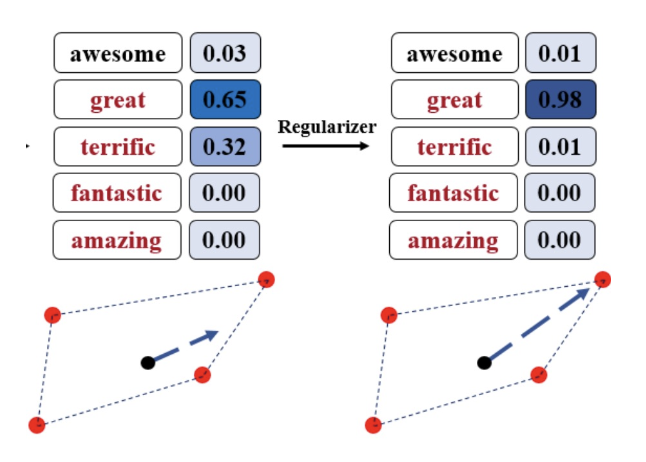 - 目标:\(\max\limits_{\hat{w}} -\log p(y | \hat{v}(x)) \textcolor{red}{- \alpha \sum\limits_{i=1}^L \dfrac{1}{L} \mathcal{H}(w_i)}\),其中 \(\mathcal{H}(w_i) = \sum\limits_{j=1}^T -w_{ij} \log(w_{ij})\)