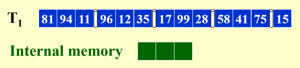 回顾前面学过的排序算法,我们发现归并排序(mergesort) 是最适合作为外部排序的算法。为了简化后续的分析过程,我们假定: