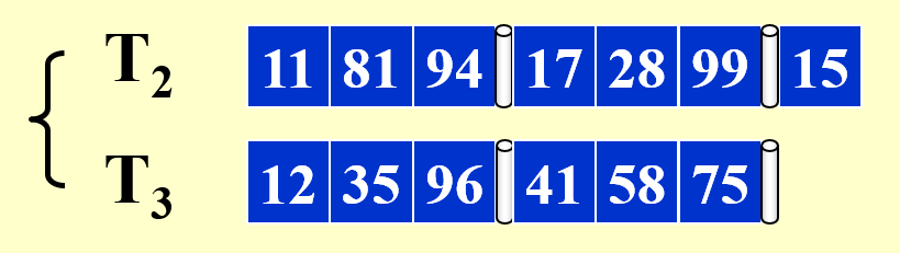 我们希望在降低趟数的同时能够尽可能避免磁带数的提升,因此尝试一下在保持子序列个数不变的情况下减少所需磁带数,下面以 \(k=2\),磁带数 = 3(比原来的少一个)为例进行分析: