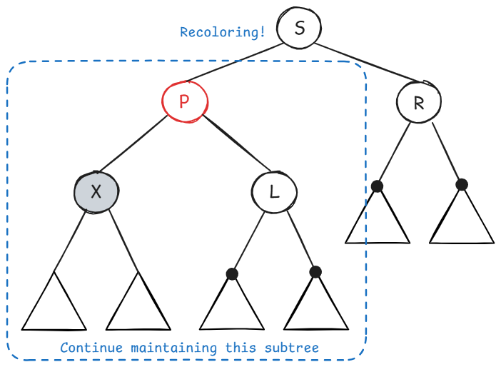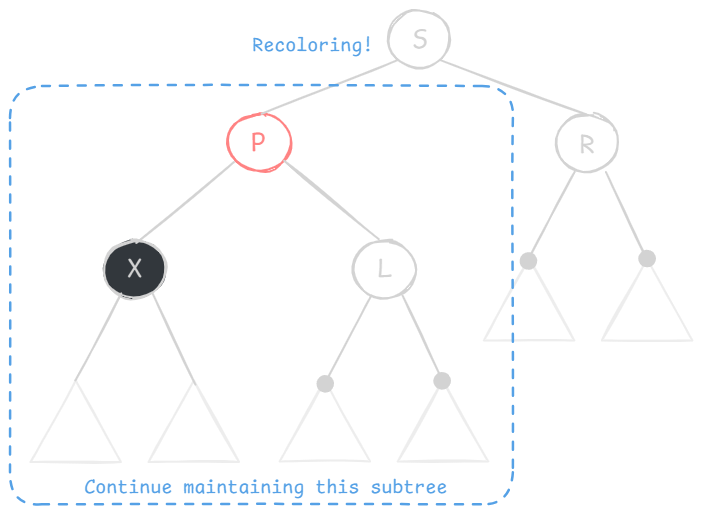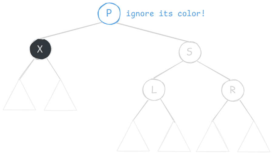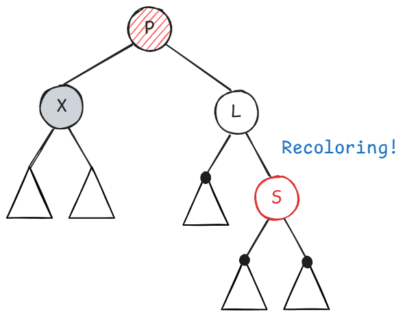 X 的兄弟节点 S 是红色的(则 S 的两个孩子、父节点 P 一定都是黑色的