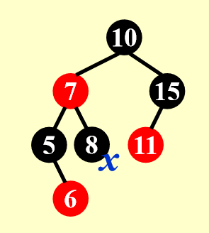 - 但很可能会遇到父节点也是红色的情况,这样需要我们做一定的调整,下面根据课件给出的例子,分情况讨论调整的方法