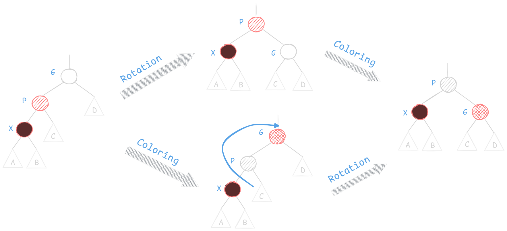 综上所述,再来看最重要(也是最麻烦)的平衡维护。这里用 X 表示当前需要维护的节点(一般是接替黑色的被删节点的孩子NIL节点