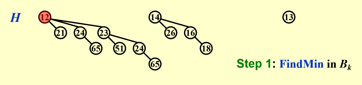 FindMin操作(找到最小值)\(\Rightarrow\ O(\log N)\) - 假设在 \(B_k\) 中找到最小值,那么将 \(B_k\) 从二项堆 \(H\) 中移除,剩下的二项堆记作 \(H'\) \(\Rightarrow\ O(1)\)