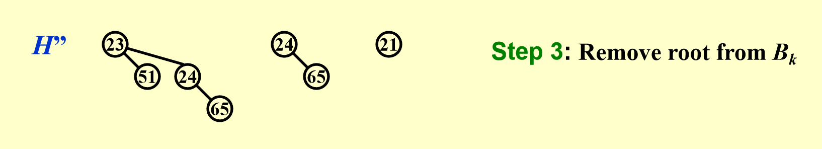 - 将 \(B_k\) 的根节点从 \(B_k\) 中移除,留下二项树 \(B_0, \dots, B_{k-1}\),记作 \(H''\) \(\Rightarrow\ O(\log N)\)
