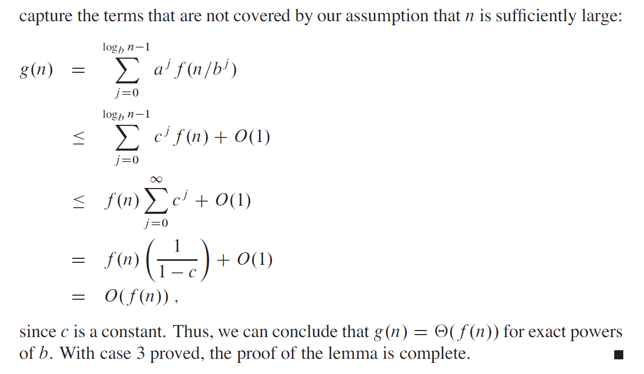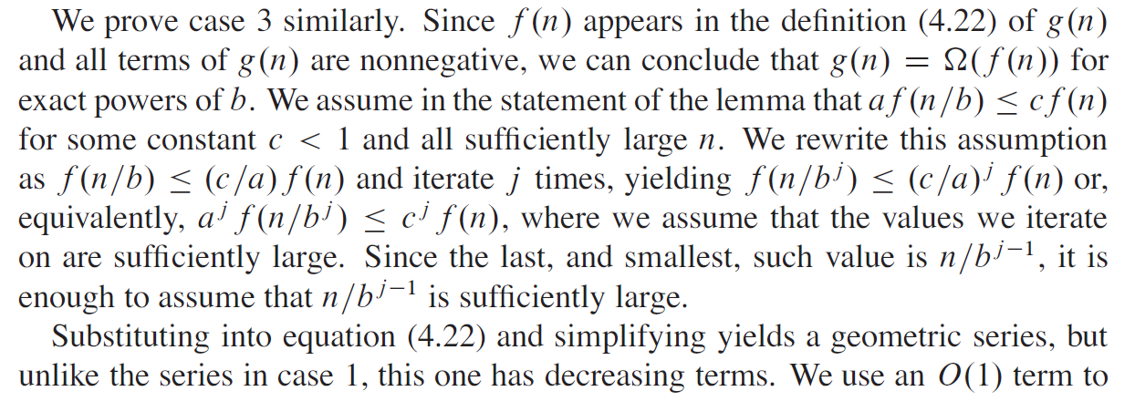- 若对于常数 \(\varepsilon > 0\),有 \(f(N) = \Omega(N^{\log_b a + \varepsilon})\),且对于常数 \(c < 1\) 和充分大的数 \(N\),有 \(af(\dfrac{N}{b}) < cf(N)\) 成立(正则条件 (regularity condition)