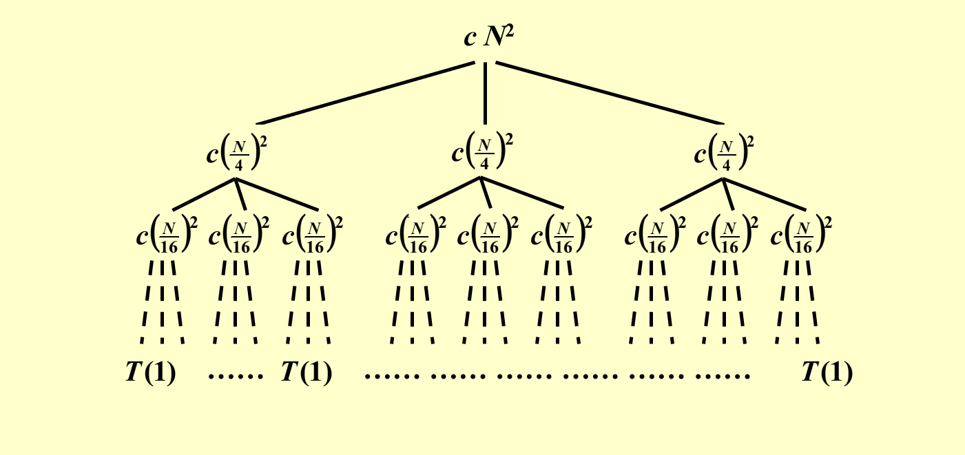 - 然而,用前一种主定理是可以算出来的:发现 \(O(N^{\log_b a - \varepsilon}) = O(N^{2 - \varepsilon}) = f(N)\),符合第 1 类情况,那么时间复杂度为 \(T = O(N^2)\)
