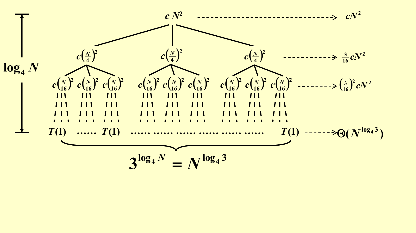 - 由以上两条信息,可以推得最后一层的节点(全是 \(T(1)\))之和为 \(3^{\log_4 N} = N^{\log_4 3} = \Theta(N^{\log_4 3})\)
