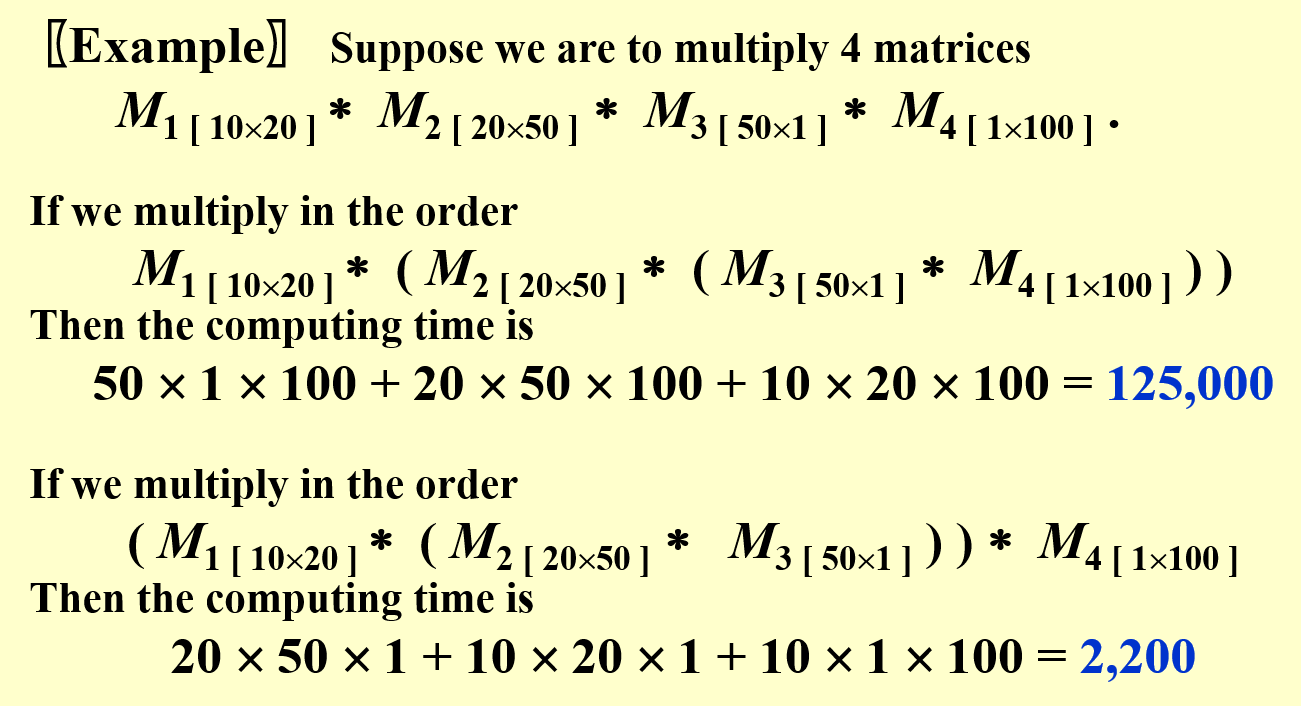 k再循环i,因为如果先循环i,当i很小,k很大时,j的取值也可以很大,那么在计算M[i][j]时,M[L + 1][j]这项还没有算出来(L + 1 > i) ,因此无法得到正确结果。 - 可以看到这个函数只是计算了 n 个矩阵的乘法的最小计算次数,并没有保存乘法的顺序。感兴趣的读者可以尝试着在该代码的基础上增添这个功能,从而最终实现一个完整的矩阵乘法的程序。