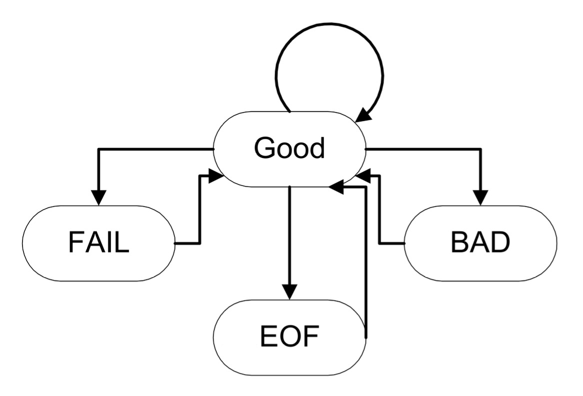 good():当状态有效时返回trueeof():当遇到 EOF 时返回truefail():当出现轻微故障或不良状态时返回truebad():当状态不良时返回true