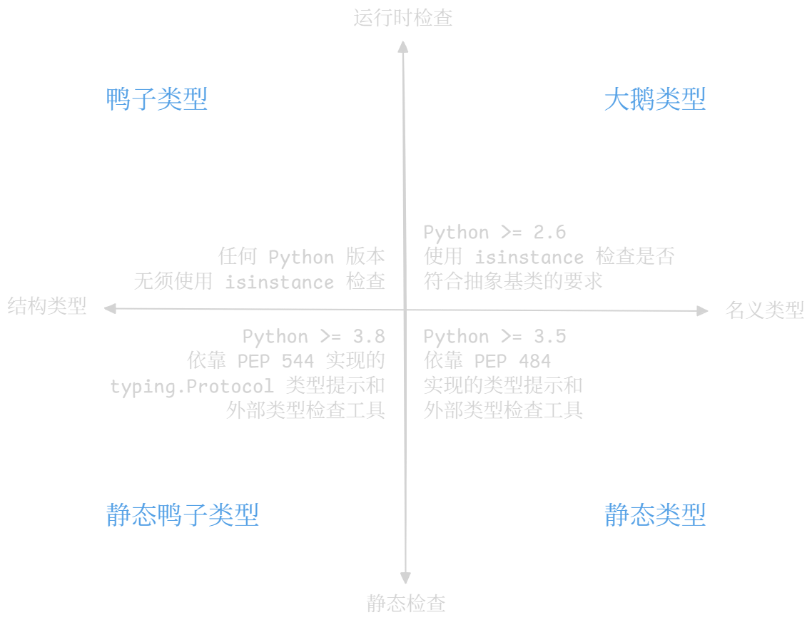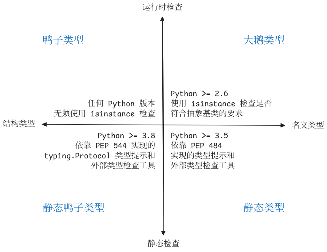 • 1——鸭子类型:直接尝试执行运算,若有问题,就捕获 TypeError 异常。缺点是可能输出容易让人误解的错误消息或意料之外的效果