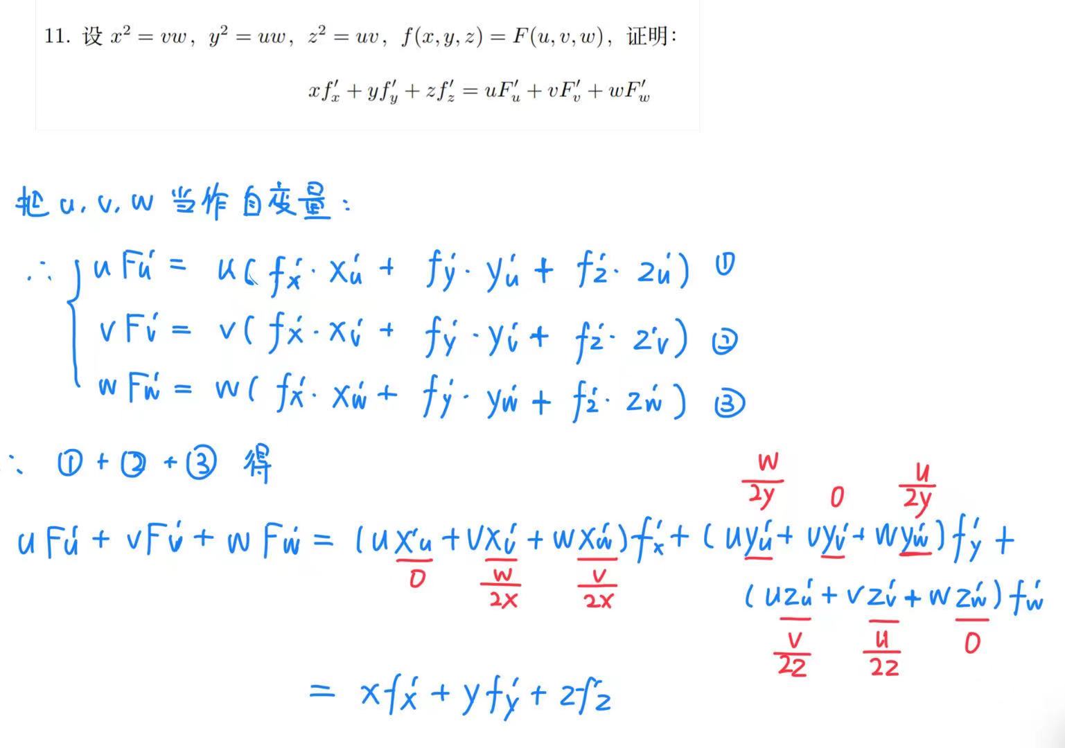 - 后者表示外函数 z = f(x, y, u) 对中间变量 x 求偏导数