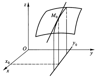 几何意义 ( 以偏导数 \(f_x'(x_0, y_0)\) 为例 ):曲面 z = f(x, y) 与平面 \(y = y_0\) 的交线在点 \(M_0\) 处的切线对 Ox 轴的斜率