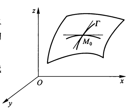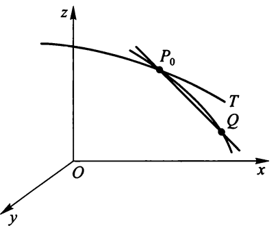切线向量为:\(\bm{v} = \bm{n_1} \times \bm{n_2} = \begin{vmatrix}\bm{i} & \bm{j} & \bm{k} \\ F_x'(P_0) & F_y'(P_0) & F_z'(P_0) \\ G_x'(P_0) & G_y'(P_0) & G_z'(P_0)\end{vmatrix}\)