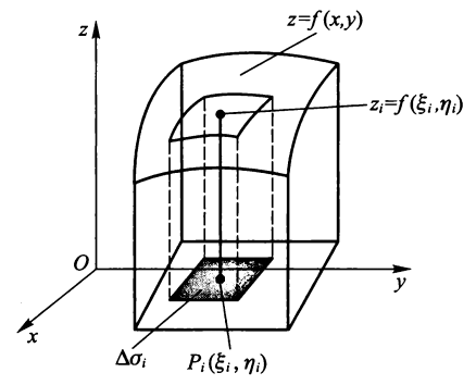 体积 \(V = \lim\limits_{\lambda \rightarrow 0} \sum\limits_{i = 1}^n f(\xi_i, \eta_i) \Delta \sigma_i\)