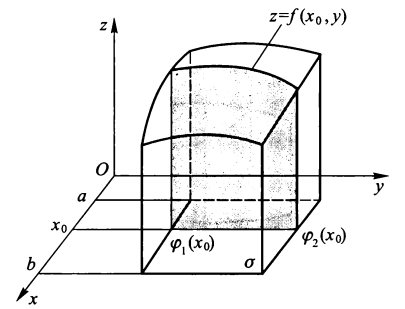 \[ \iint\limits_\sigma f(x, y) \mathrm{d}\sigma = \iint\limits_\sigma f(x, y) \mathrm{d}x\mathrm{d}y = \int_a^b\mathrm{d}x \int_{\varphi_1(x)}^{\varphi_2(x)}f(x, y)\mathrm{d}y \]