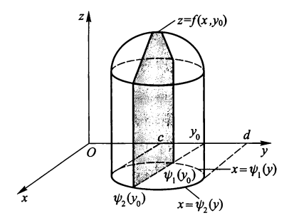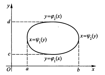 \[ \iint\limits_\sigma f(x, y) \mathrm{d}\sigma = \iint\limits_\sigma f(x, y) \mathrm{d}x\mathrm{d}y = \int_c^d\mathrm{d}y \int_{\psi_1(y)}^{\psi_2(y)}f(x, y)\mathrm{d}x \]