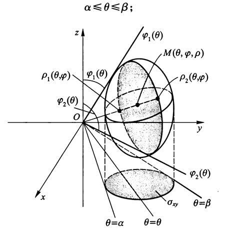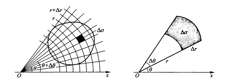 \[ \iint\limits_\sigma f(x, y) \mathrm{d}\sigma = \int_\alpha^\beta \mathrm{d}\theta \int_{r_1(\theta)}^{r_2(\theta)}f(r\cos \theta, r\sin \theta)r \mathrm{d}r \]