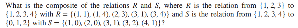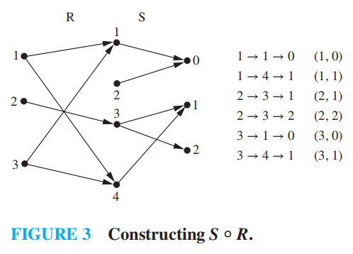 关系也可以像函数一样被复合 (composite):对于一个从 \(A\) 到 \(B\) 的关系 \(R\),和一个从 \(B\) 到 \(C\) 的关系 \(S\),\(R\) 和 \(S\) 的复合关系\(S \circ R\) 由有序对 \((a, c), a \in A, c \in C\) 构成,且存在 \(b \in B\),使得 \((a, b) \in R, (b, c) \in S\)。