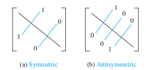 - 对称性 (symmetric):\(\forall a, b \in A((a, b) \in R \rightarrow (b, a) \in R)\)