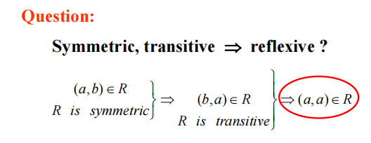 但是,考虑 \(\exists a \forall b (a\not{R}b)\) 的情况,也就是说 \(a\) 和谁都没有关系,是孤立的;这样就无从得知 \(aRa\) 了。