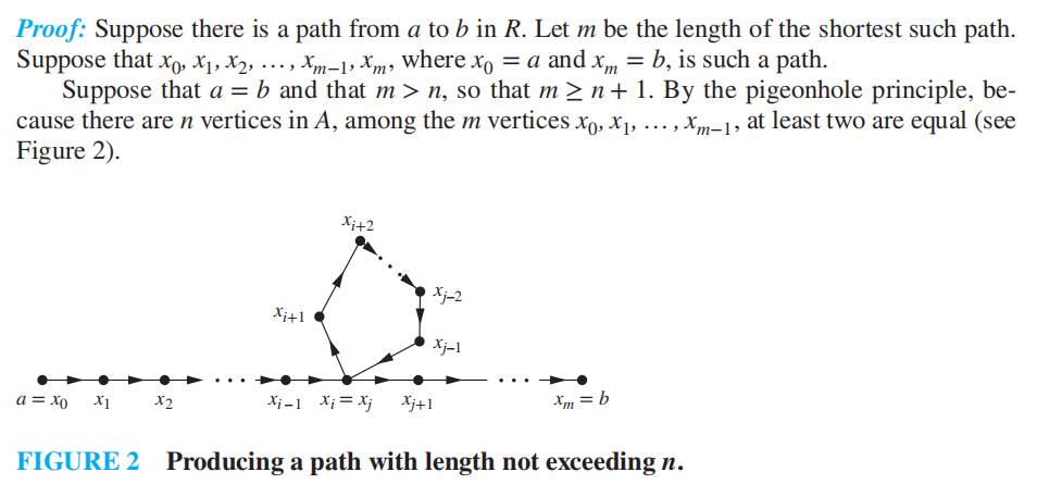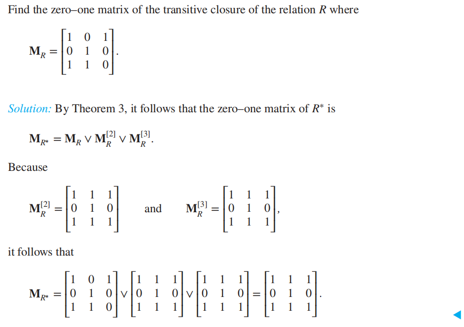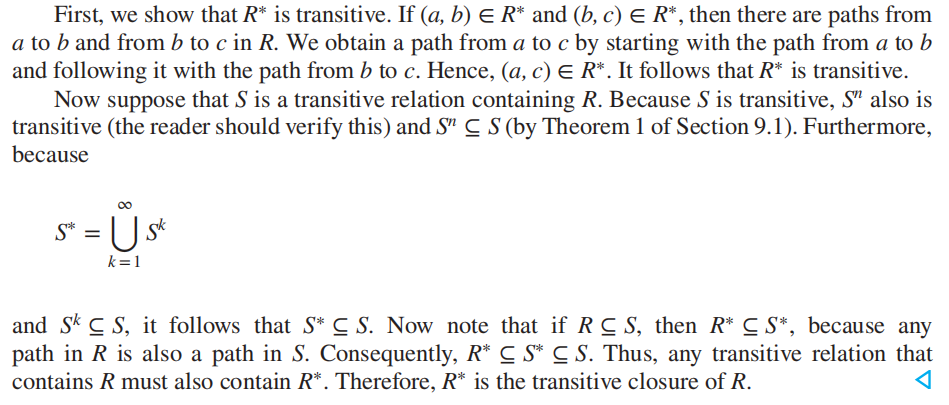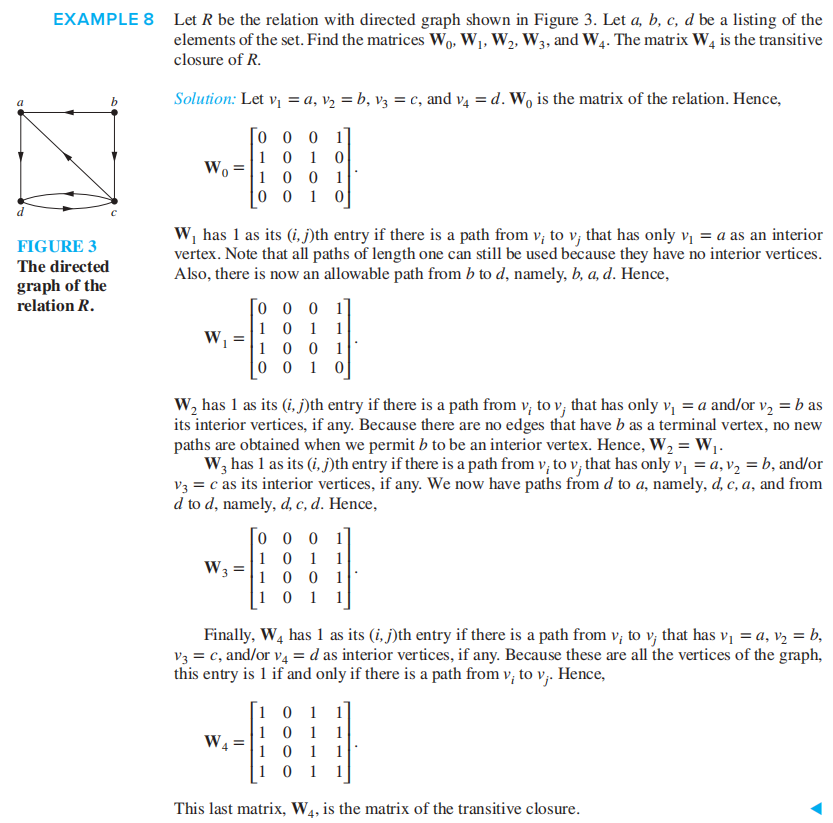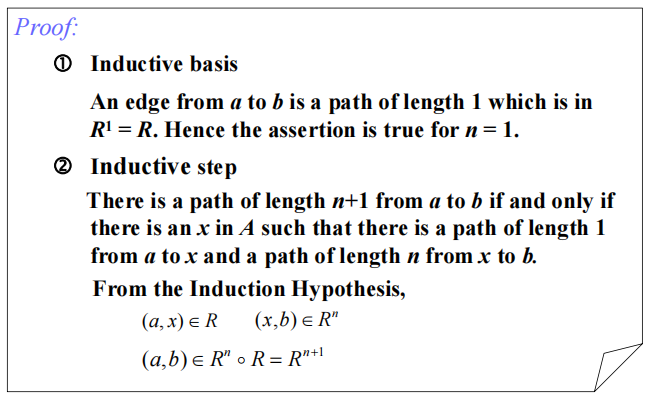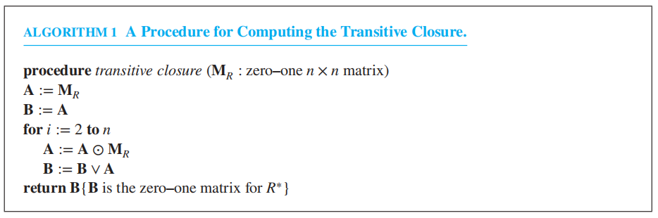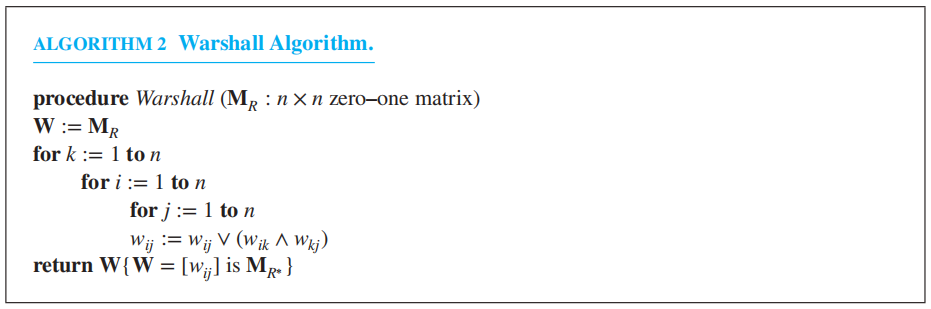 定义:令 \(R\) 是在集合 \(A\) 上的关系,幂 \(R^n, n = 1, 2, 3, \dots\) 被递归定义为: $$ R^1 = R \quad R^{n+1} = R^n \circ R $$ 定理 1:当且仅当 \(R^n \subseteq R, n = 1, 2, 3, \dots\) 时,在集合 \(A\) 上的关系 \(R\) 具有传递性