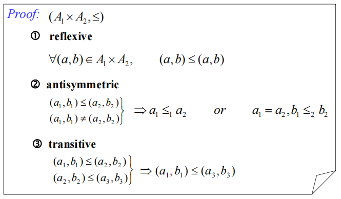- 假设 \((S, \preceq_1)\) 和 \((T, \preceq_2)\) 为偏序集,当 \((s, t) \preceq (u, v)\) 时 \((S \times T, \preceq)\) 为偏序集的充要条件是:\(s \preceq_1 u\) 且 \(t \preceq_2 v\)