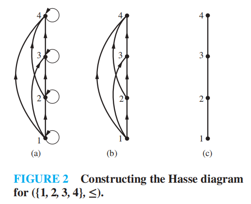 - 因为偏序是自反的,所以每个顶点都会有一个环\((a, a)\),将这些环全部移除