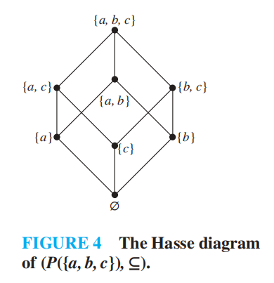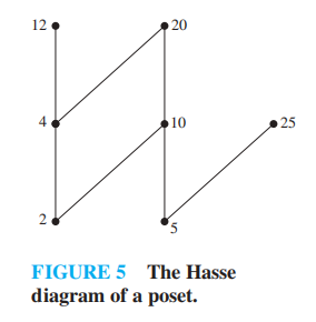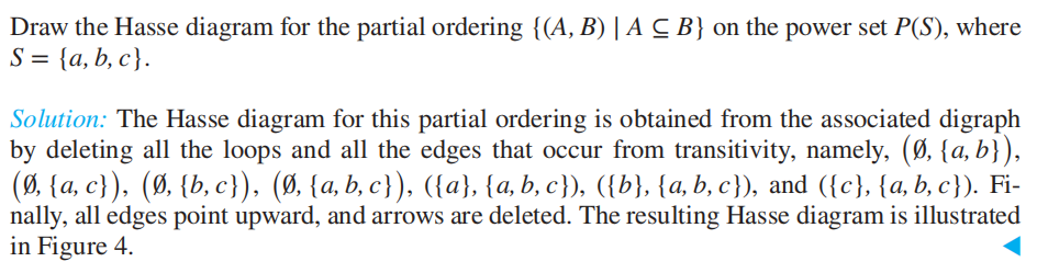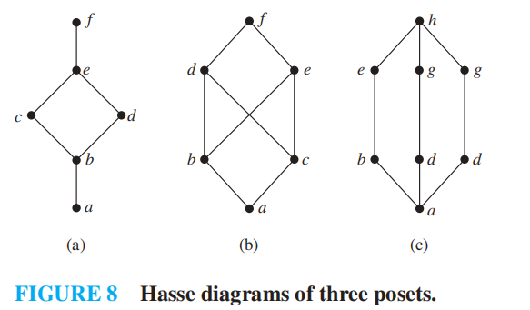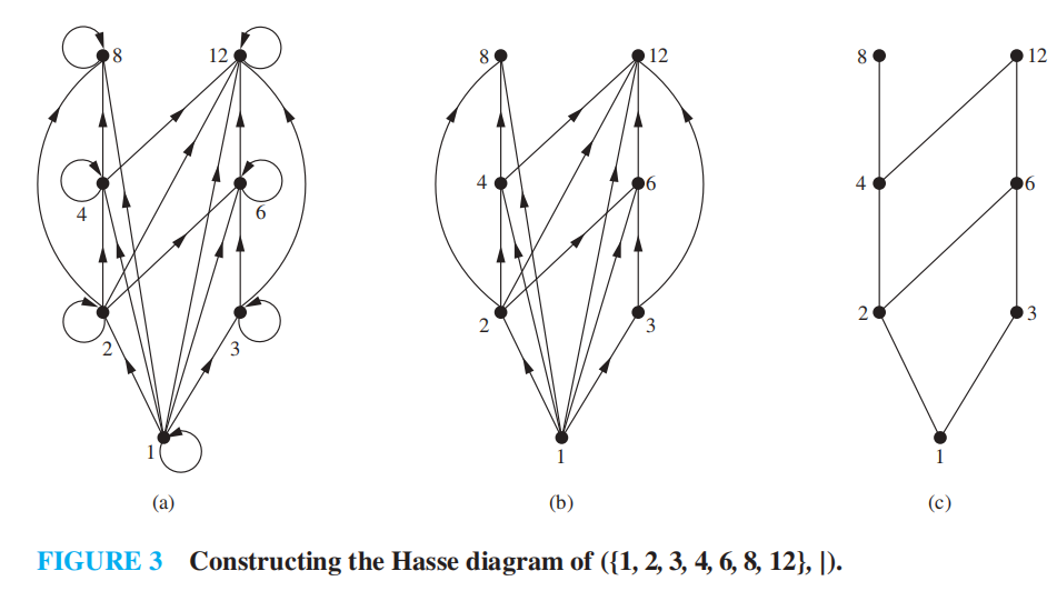 观察发现,\((S, \preceq)\) 的哈斯图中向上指的边,与 \((S, \preceq)\) 的覆盖关系相对应。因此,我们可以从覆盖关系中还原它的偏序集,因为偏序集是覆盖关系的自反传递闭包。这告诉我们可以从哈斯图中构造偏序。