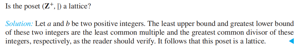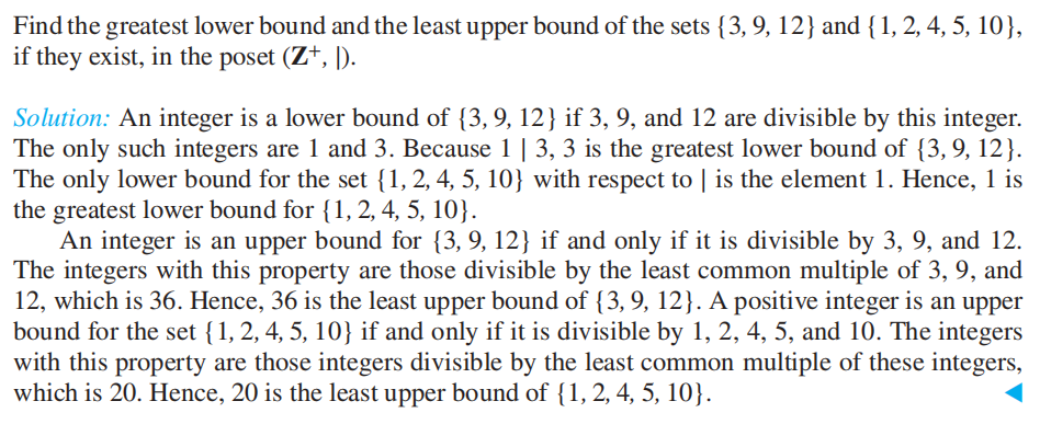 \(l \preceq a\ \Rightarrow\) \(l\) 被称为 \(A\) 的下界 (lower bound)