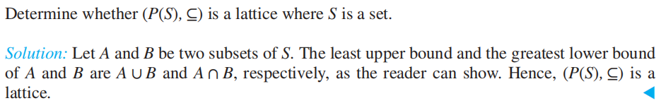 - 格 \((P(S), \subseteq)\) 是可分配的,其中 \(P(S)\) 是有限集的幂集