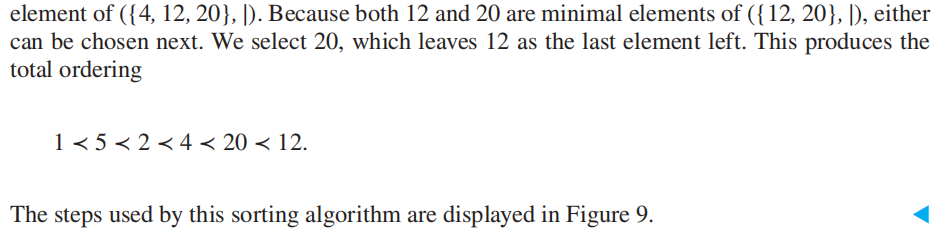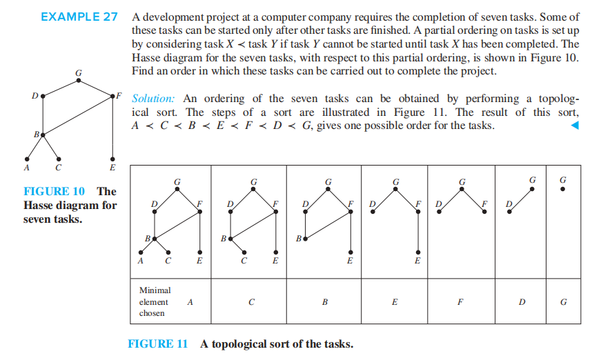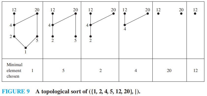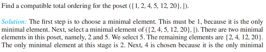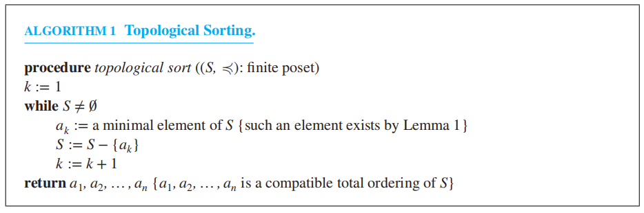 - 由于 \(A\) 是有限集,所以该过程最终一定会终止。最后我们得到序列 \(a_1, a_2, \dots, a_n\)。全序 \(\preceq _t\) 为:\(a_1 \prec_t a_2 \prec_t \dots \prec_t a_n\)。该全序与原来的偏序兼容。