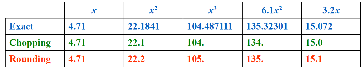 比较精确计算,以及分别使用截断和舍入两种方法近似的结果: