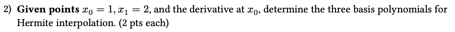 - \(\begin{cases}h_0(x) = C_0(x - x_1)^2(x - x_2) \\ h_0(x_0) = 1 \Rightarrow C_0\end{cases} \quad \Rightarrow \quad h_0(x) = \dfrac{(x - x_1)^2(x - x_2)}{(x_0 - x_1)^2(x_0 - x_2)}\)