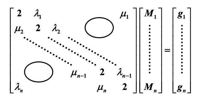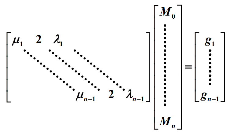 根据 \(S_j'(x_j) = S_{j+1}'(x_j)\),我们可以结合 \(M_{j-1}, M_j, M_{j+1}\) 的系数——定义 \(\lambda_j = \dfrac{h_{j+1}}{h_j + h_{j+1}}, \mu_j = 1 - \lambda_j, g_j = \dfrac{6}{h_j + h_{j+1}} (f[x_j, x_{j+1}] - f[x_{j-1}, x_j])\),可以得到:\(\mu_j M_{j-1} + 2M_j + \lambda_j M_{j+1} = g_j\ (1 \le j \le n - 1)\)(下图就是这个递推式的矩阵表示(一个三对角矩阵