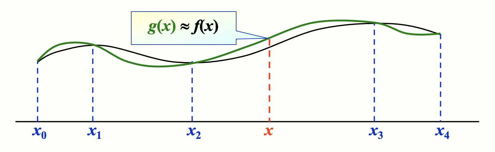 如果函数 \(y = f(x)\) 的计算过于复杂,或者甚至是未知的,一种近似求解的办法是:首先在一组点序列 \(x_0, \dots, x_n\) 上获取一组函数值 \(y_0 = f(x_0), \dots, y_n = f(x_n)\),然后根据这些值构造一个相对简单的近似函数 \(g(x) \approx f(x)\)。
