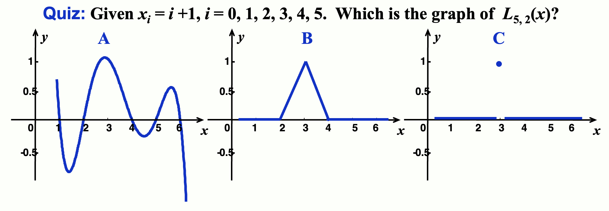 - 因此,在 \(k+1\) 个点 \(x_0, x_1, \dots, x_k\) 上向 \(f\) 插值的第 \(k\) 个拉格朗日多项式是唯一的