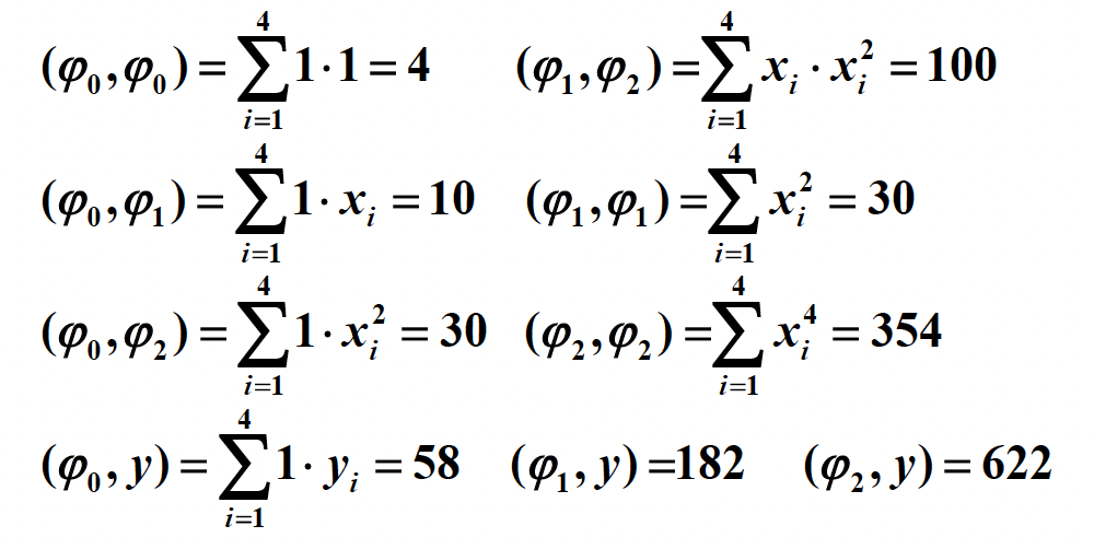 令 \(P(x) = a_0 \varphi_0(x) + a_1 \varphi_1(x) + \dots + a_n \varphi_n(x)\),然后与求解离散问题类似:\(\dfrac{\partial E}{\partial a_k} = 0\),即对于所有 \(a_k\) 偏导数为 0 时误差取最小值。将等号左侧公式化简,可以得到:\(\sum\limits_{j=0}^n (\varphi_k, \varphi_j) a_j = (\varphi_k, f), k = 0, \dots, n\),也就是说: